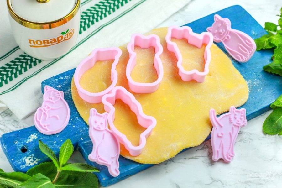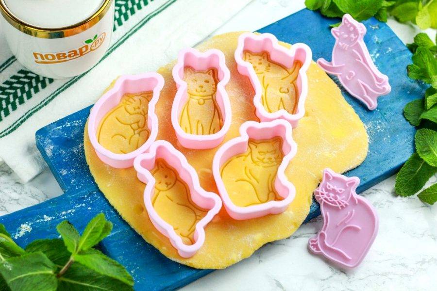 Затем охлажденное тесто разделите на две части и раскатайте в округлый пласт, подсыпая рабочую поверхность мукой. Обмакните плунжеры в муку и вырежьте из теста фигурки печенья.