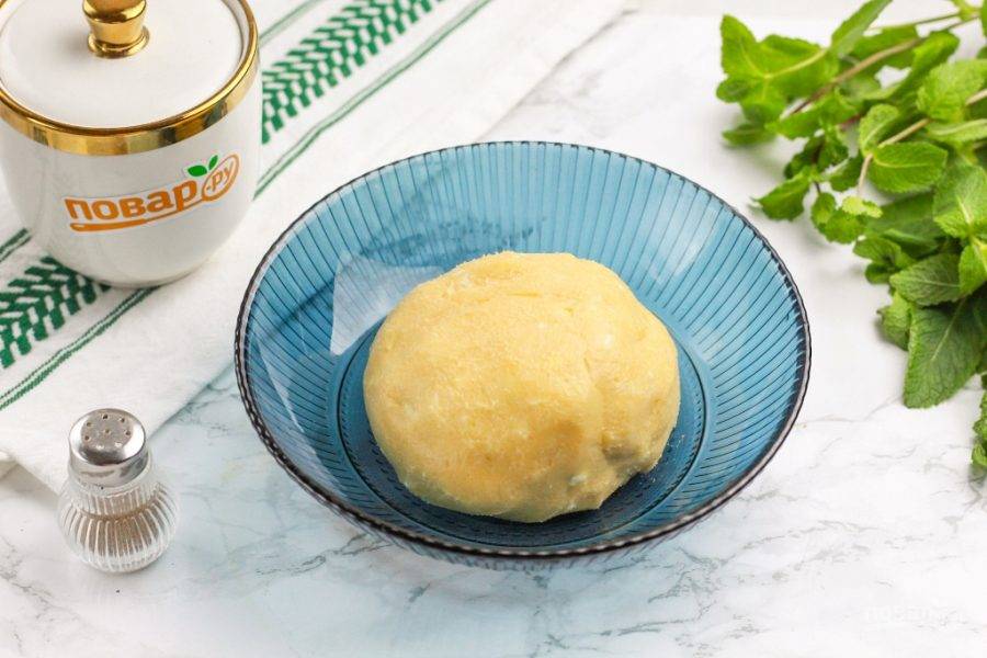 Оно должно получиться плотным, липким. Немного муки оставьте на раскатку, чтобы тесто не прилипало к поверхности. Скатайте колобок из теста и накройте пищевой пленкой. Отправьте в холодильник на 20 минут.