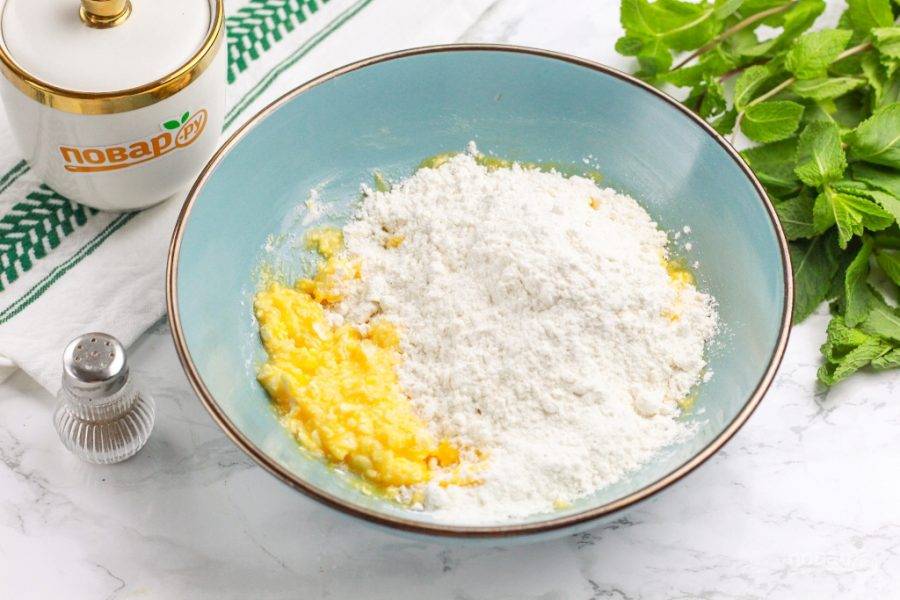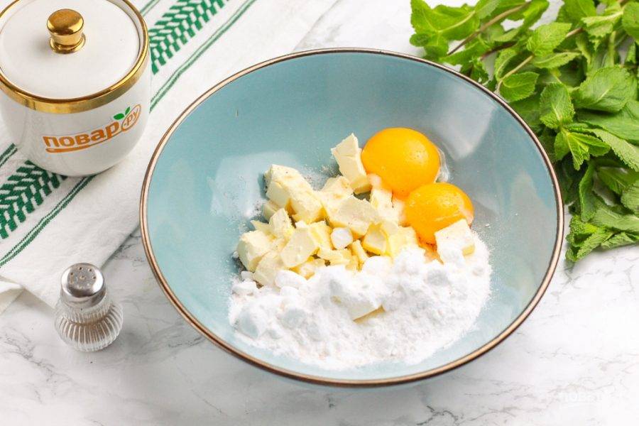 Нарежьте сливочное масло в глубокую емкость кубиками или кусочками. Всыпьте соль и сахарную пудру, добавьте желтки куриных яиц. Лучше всего использовать пудру, чтобы крупинки сахара не попадались в тесте. Тщательно разотрите все между собой.