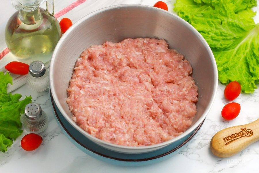 Подготовьте указанные продукты. Фарш разморозьте, если приобретали замороженным и отожмите от лишней жидкости. Лук очистите от шелухи и промойте в воде.