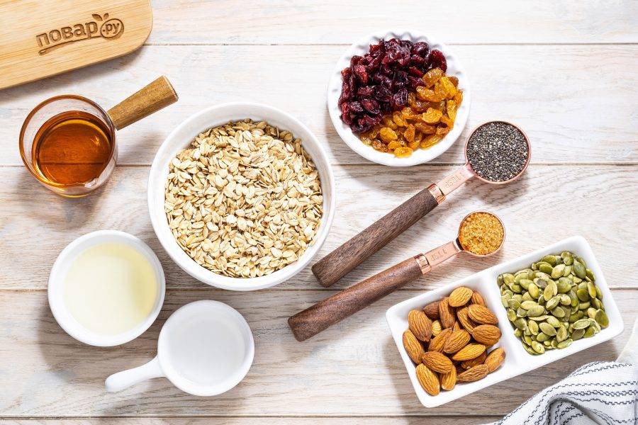 Мюсли и орехи с семечками должны хорошо подрумяниться. После добавьте изюм и вяленую вишню.