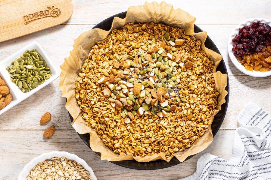 Когда мюсли начнут приобретать золотистый цвет, добавьте измельченные миндальные орехи, тыквенные семечки и семена чиа. Перемешайте и запекайте еще 10-15 минут.