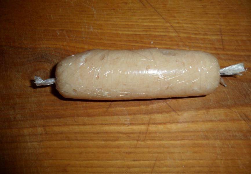 Утрамбовываем сосиску, слоев пленки должно быть несколько, концы завяжите, обрежьте лишние.