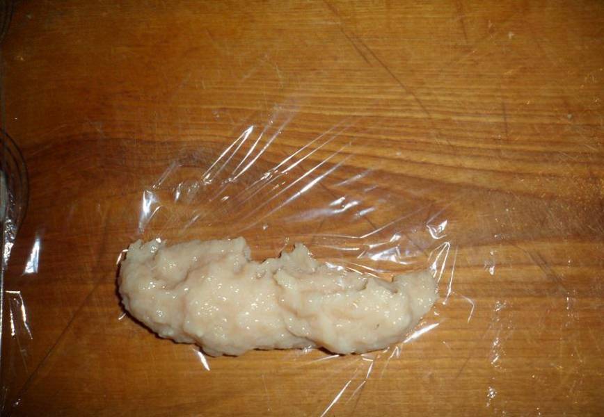 Теперь формируем сосиски. Разложите пищевую пленку. Делать можно из 2 ст.л. сосиску, можно больше, как вам нравится.