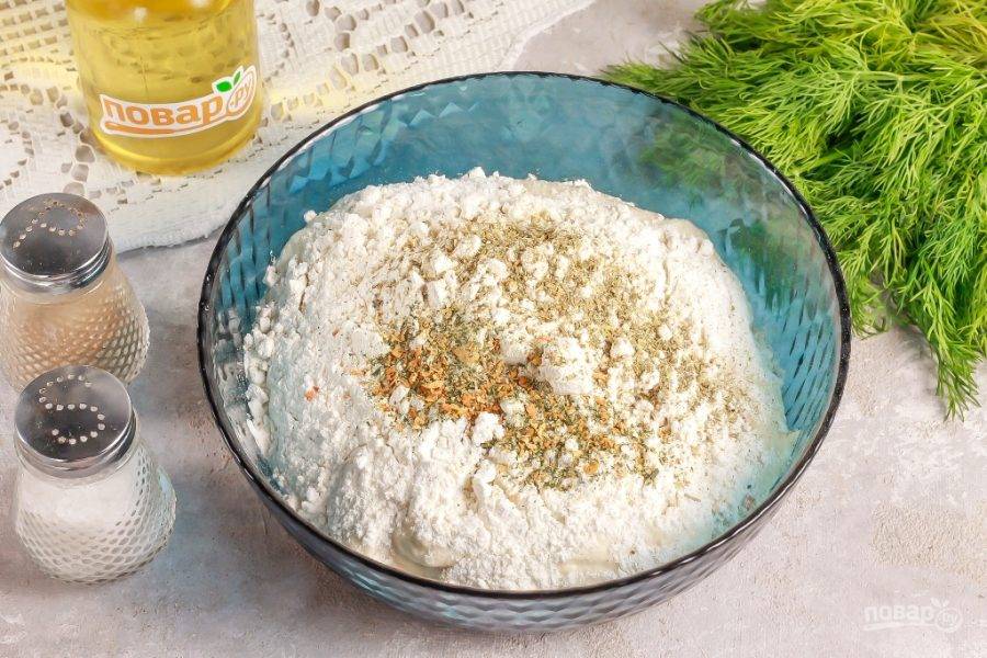 Обомните опару и всыпьте еще треть пшеничной муки и приготовленные приправы, специи. Влейте 2 ст.л. растительного масла и тщательно вымешайте тесто, подсыпая муку на рабочую поверхность.