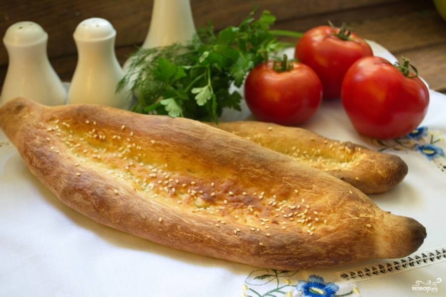 Сформируйте лаваш с высокими бортиками. Для этого тесто нужно раскатать в пласт овальной формы. Слегка подкрутить бортики, приподнять тесто над столом и перевернуть, бортиками вниз. Наколите середину лаваша, чтобы при запекании оно не вздулось.