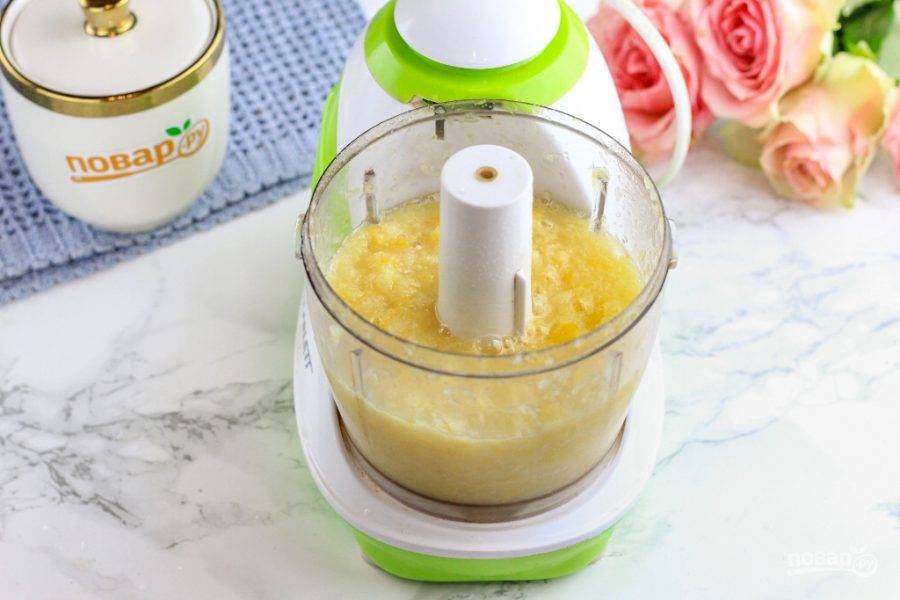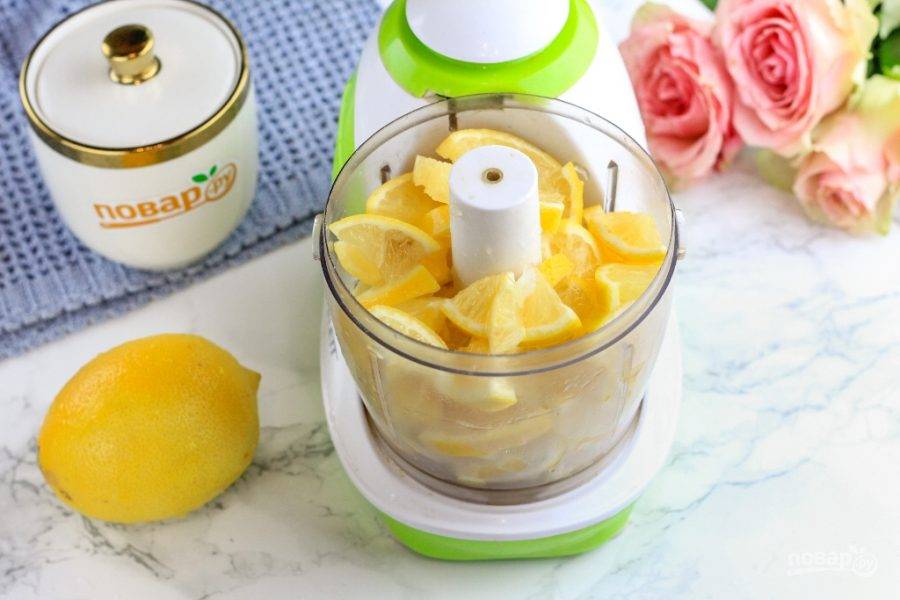 Измельчите всю лимонную нарезку практически в пюре на пульсирующем режиме, вам потребуется 4-5 минут.