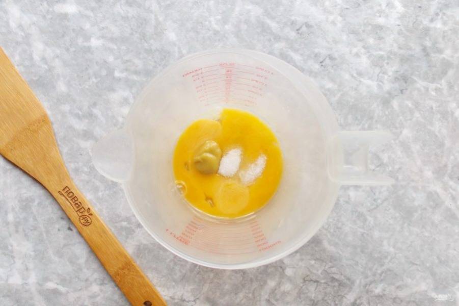 На малой скорости миксера смешайте желтки, соль, сахар и горчицу. После по капле вводите в эту смесь подсолнечное масло, сохраняя малую скорость миксера. Масло с желтками должно постепенно соединиться в однородную эмульсию.