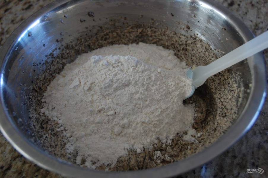 6. Всыпьте мучную смесь к смеси масла, с помощью силиконового шпателя аккуратно перемешайте до однородности.