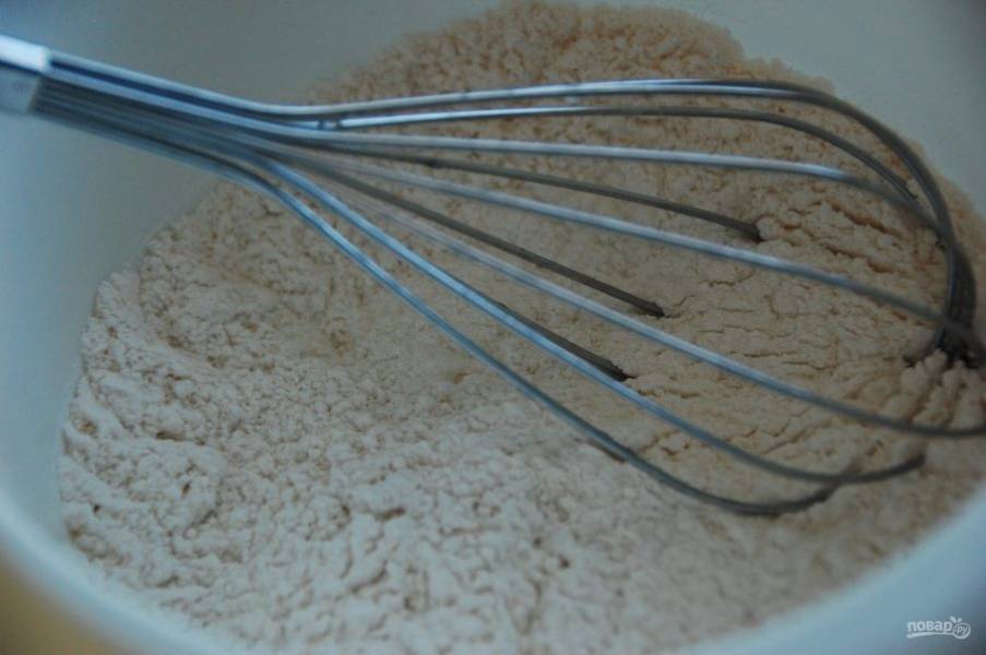 2. В отдельную емкость просейте муку, добавьте разрыхлитель и соль, перемешайте.