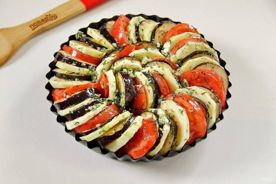 Сверху выложите овощи, чередуя их между собой. Смажьте овощи при помощи кулинарной кисти чесночной заправкой. Накройте форму фольгой и поставьте в разогретую до 200 градусов духовку примерно на 1 час.