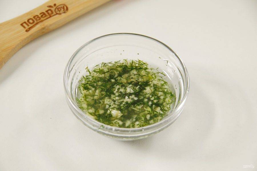 Укроп измельчите, добавьте 3 ст. л. оливкового масла, немного соли и пропущенный через пресс чеснок.