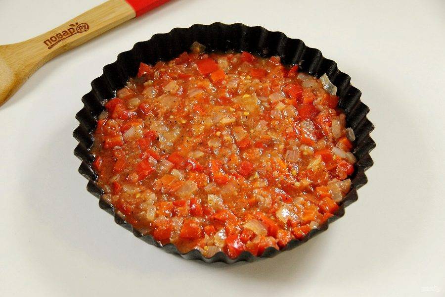 Выложите томатный соус на дно формы для запекания.
