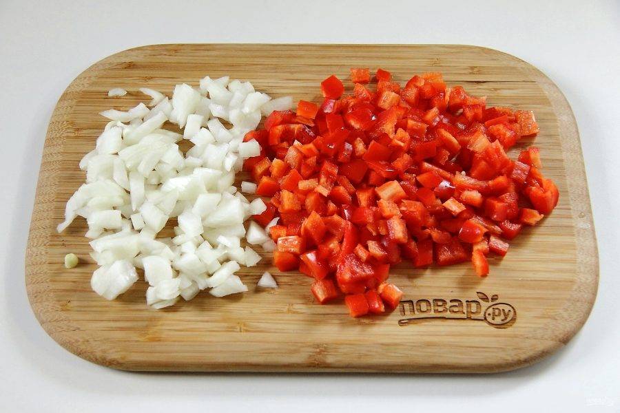 Лук и перец нарежьте кубиками.