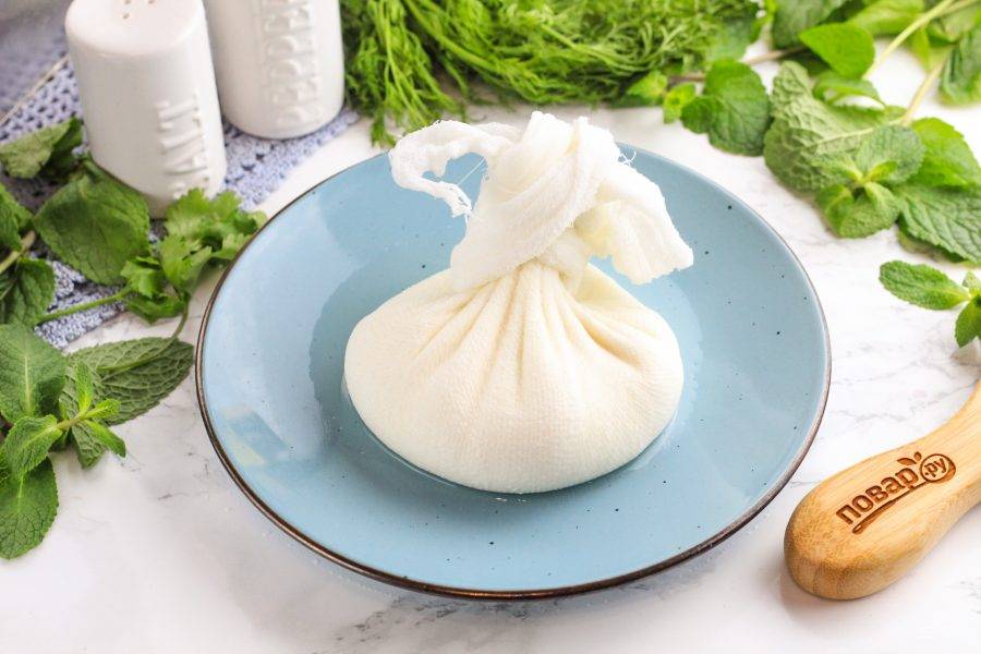 Соберите края марли в мешочек и завяжите. Подвесьте над раковиной и дайте стечь примерно 30-40 минут.