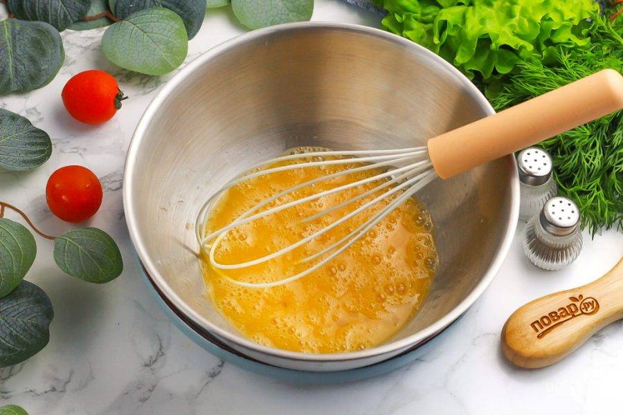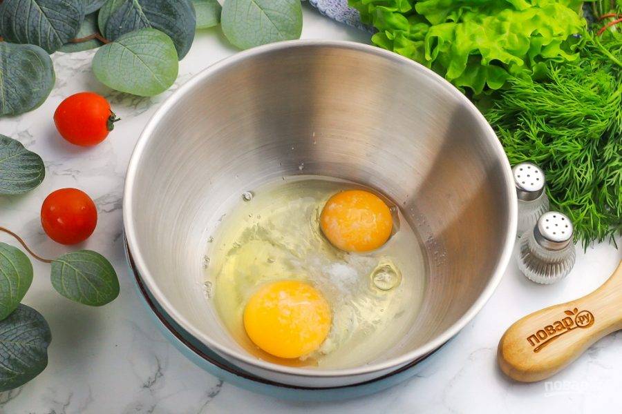Куриные яйца вбейте в глубокую емкость: салатник или миску. Всыпьте соль. Добавьте и другие специи или пряности, если планируете.