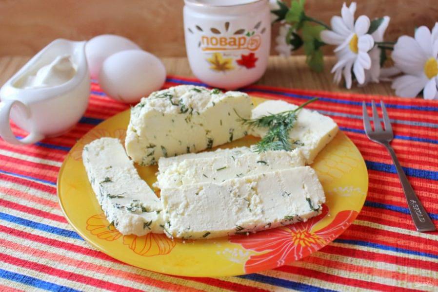 Домашний сыр с укропом готов. Подавайте на завтрак, полдник или на перекус.