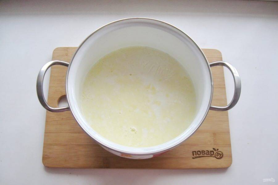 Молоко налейте в кастрюлю и поставьте на плиту.