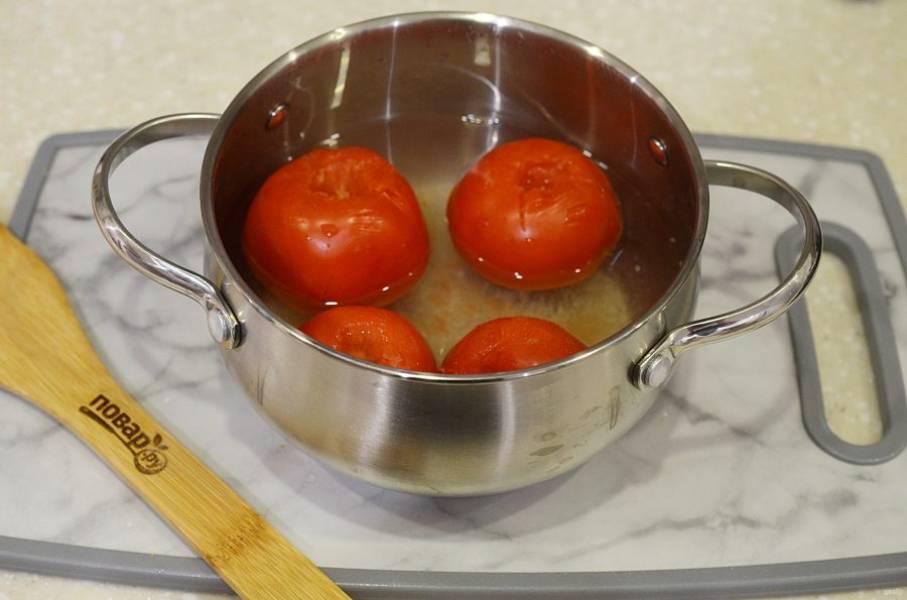 2. У помидоров вырежьте плодоножку и бланшируйте пару минут.