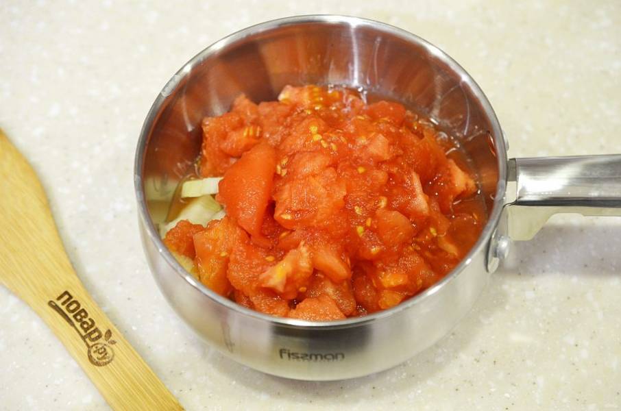 4. В сотейнике тушите лук, чеснок и помидоры, пока масса не уменьшится вдвое.
