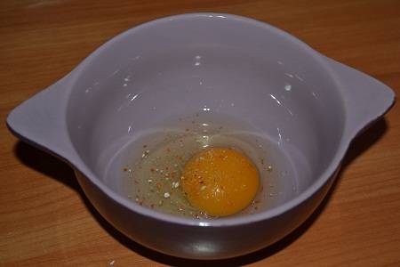 Яйцо вбиваем в миску, добавляем соль и 1 ст.ложку воды.