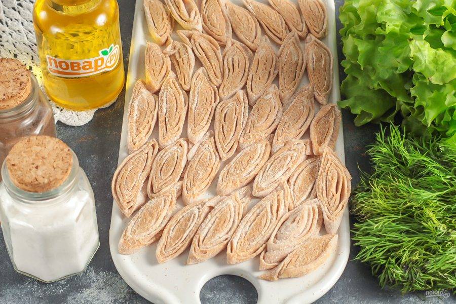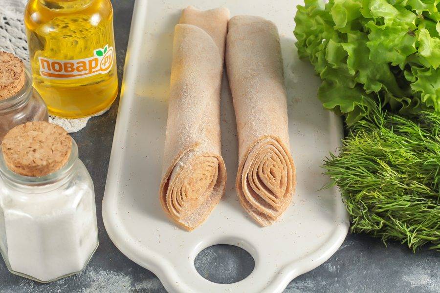 Спустя указанное время присыпьте оставшейся мукой рабочую поверхность и раскатайте тесто в тонкий пласт. Присыпьте его мукой, желательно побольше, и сверните плотным рулетиком.