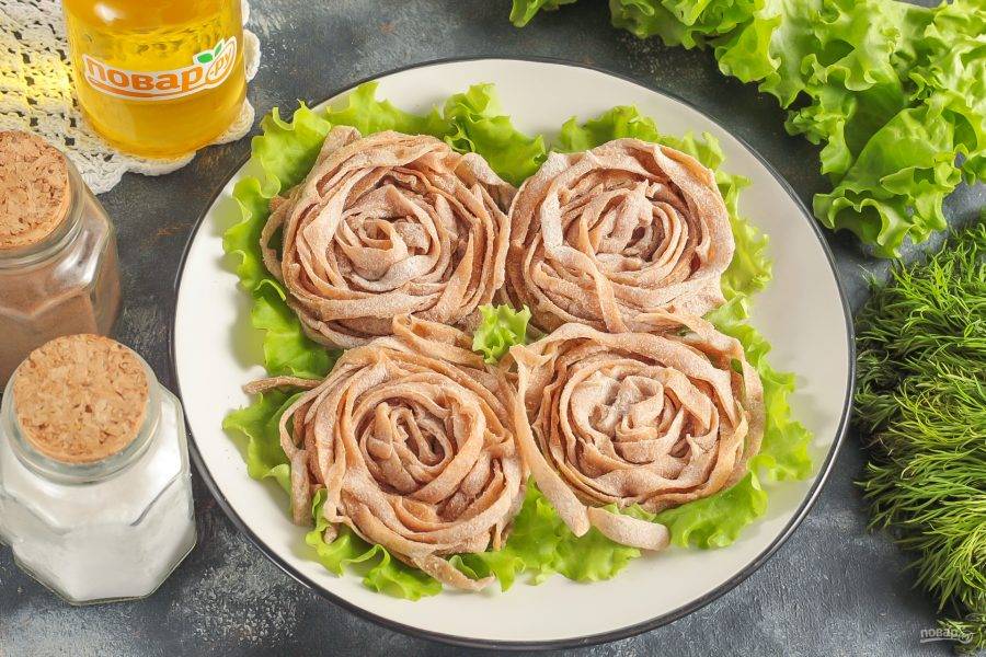Затем разверните каждый слайс и выложите лапшу на рабочую поверхность тонкой лентой. Примерно 6-7 лент сверните розочкой и выложите на противень, доску или тарелку для просушивания. Вам понадобится 1-2 дня, чтобы лапша полностью просохла. Теперь ее можно отваривать!