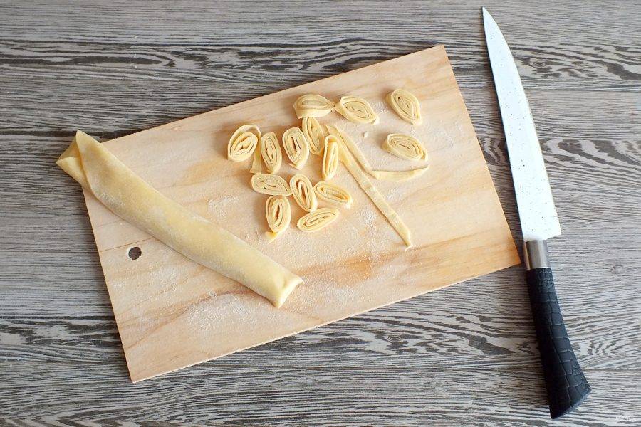 Рулетик нарежьте на кусочки толщиной 3-4 мм. И сразу же их раскрутите.