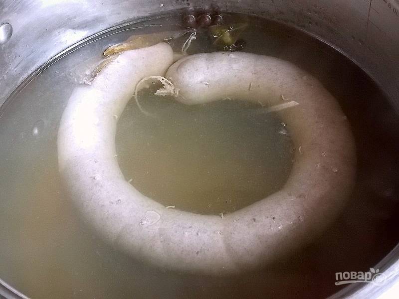 В мультиварку налейте кипяток, посолите, добавьте лавровый лист и душистый перец. Проколите колбасу в нескольких местах зубочисткой. Положите в чашу, установите t=80, закройте крышкой и варите в течение 40 минут.