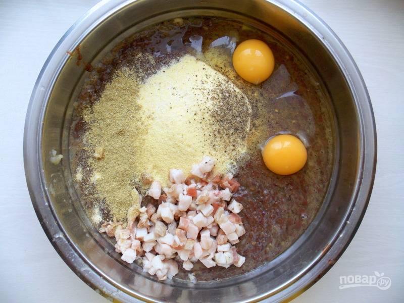 Добавьте манку, резанное на мелкие кусочки сало, сливки, яйца, специи, соль.