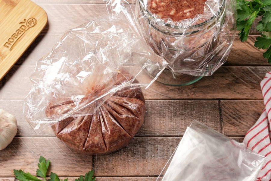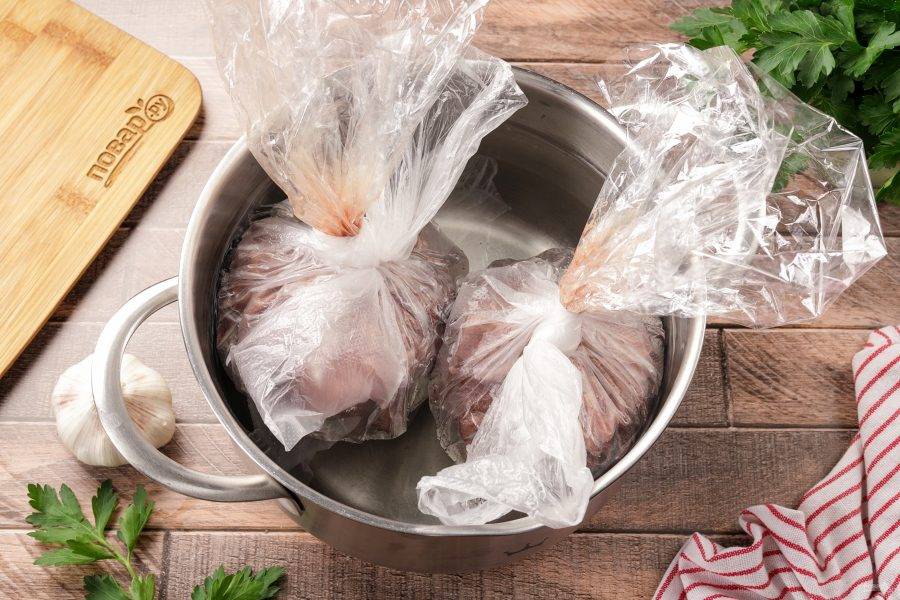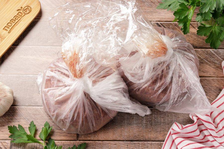 Хорошо всё перемешайте до однородной массы. Теперь прежде чем приступим к следующему действию, несколько слов о пакетах. В оригинальном рецепте используют только целлофановые пакеты, у меня пакеты и рукав для запекания. Можно приготовить и так, и так.