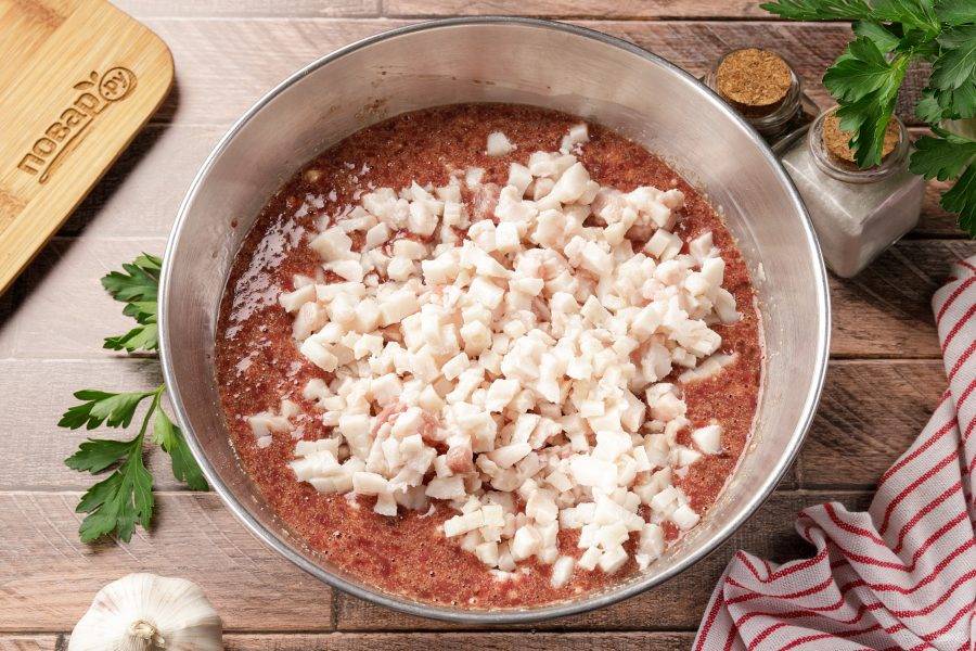 Добавьте нарезанное мелкими кубиками сало. Чтобы сало легче было резать, оно должно быть подмороженное. Сало для этой колбасы можно взять самое простое, не нужно красивое, толстое, с обязательными прослоечками. Достаточно выбрать свежее сало. Мало того, даже на шкурку необязательно обращать внимание: будет она жесткой или мягкой, нас в данном случае не касается.