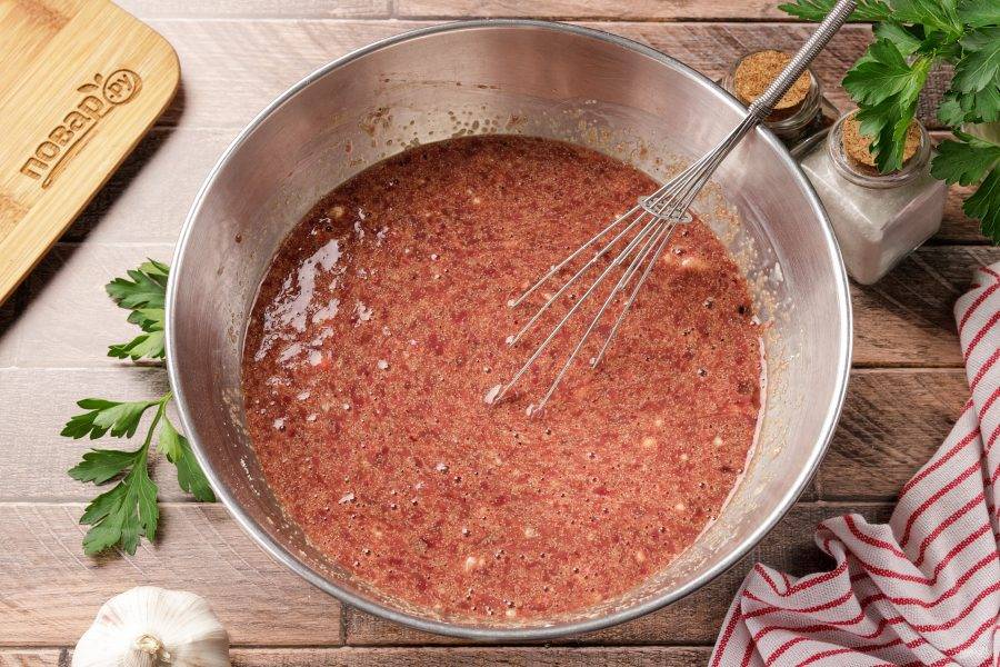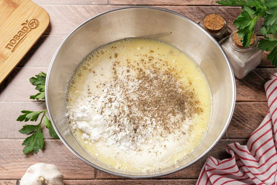 Добавьте взбитые яйца, манку, крахмал, давленый чеснок, соль и молотый перец по вкусу. Можете добавить любые любимые специи.