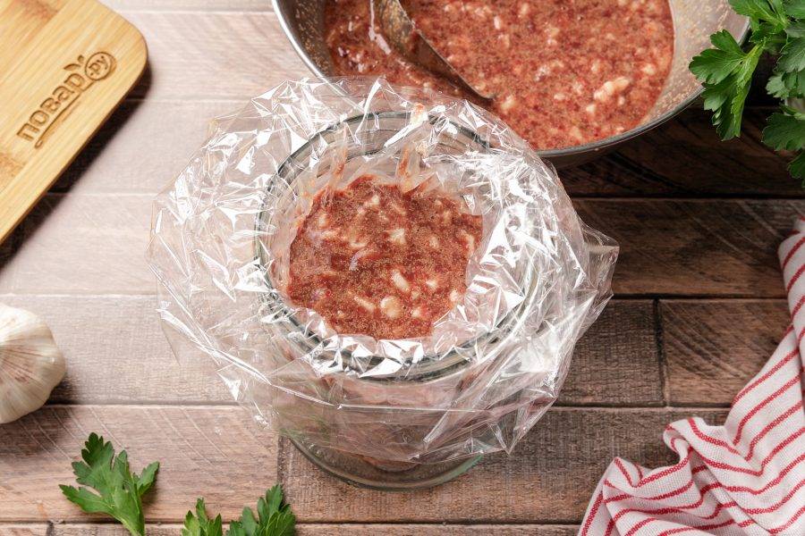 Одну вторую часть печёночной массы налейте в рукав для запекания, снизу хорошенько перевязав его от протекания. Я для удобства помещаю рукав в широкую литровую банку.