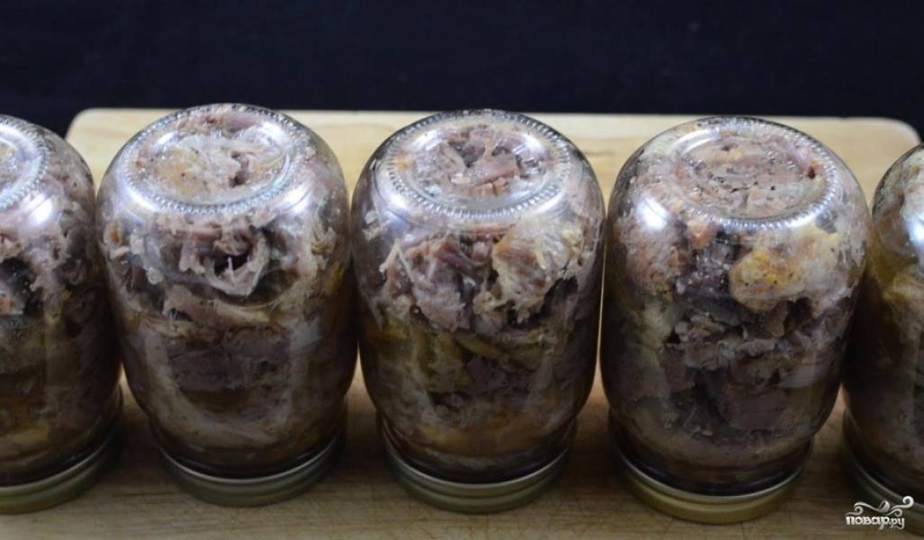 Когда мясо еще горячее туго закупориваем банки крышками.