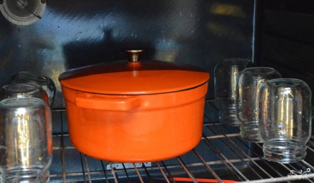 Затем стерилизуем банки. Для этого их сначала хорошенько моем, а затем помещаем в духовку на 15 минут.