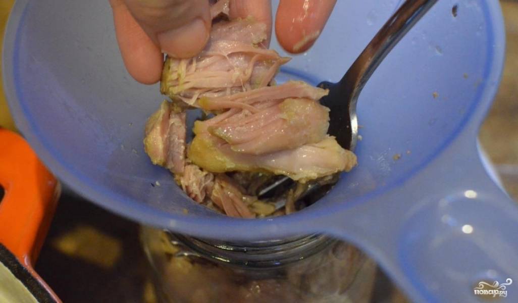 Мясо перекладываем в банки с выделившемся соком.