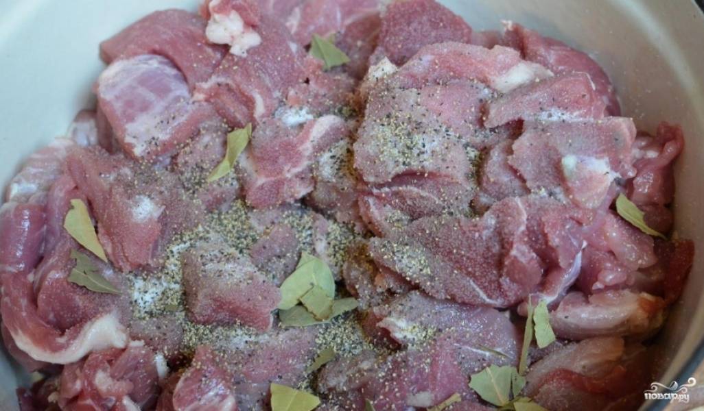 Кусочки мяса складываем в гусятницу или в толстостенную кастрюлю, солим, перчим их , добавляем мелко нарезанный чеснок, лавровый лист. Накрываем крышкой и отправляем выпекаться в духовку при 120 градусах на 4-6 часов.