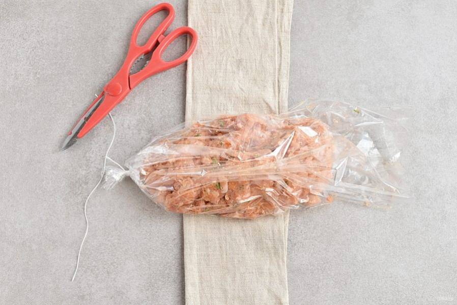 Уплотните фарш по всей длине, постукивая пакетом по столу. Подверните лишнюю ширину рукава вокруг будущей ветчины. Заверните второй край и завяжите его. Перетяните ветчину ниткой вокруг на манер колбасы. Все это в дальнейшем так же облегчит нарезку ветчины.