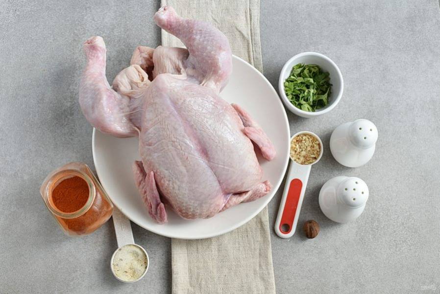 Снимите с курицы всю мякоть. Шкурку рекомендую оставить, она придаст ветчине сочность. Нарежьте мякоть удобными для мясорубки или блендера кусочками. Филе отложите.