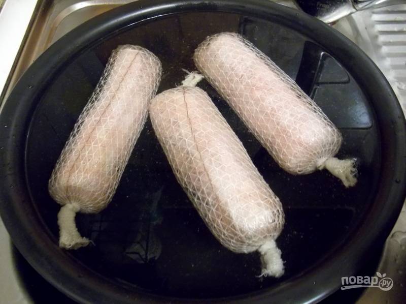 Перемешайте и разделите фарш на 3-4 части. Затем каждую отбейте и сформируйте в плотный батончик, заверните в пищевую пленку, чтобы вода не могла попасть во внутрь. Упакуйте каждый батончик в формовочную сетку, плотно завяжите концы. Сложите в чашу мультиварки и залейте полностью водой комнатной температуры. Установите в режиме "Мультиповар" t=80 и время — 2.5 часа.