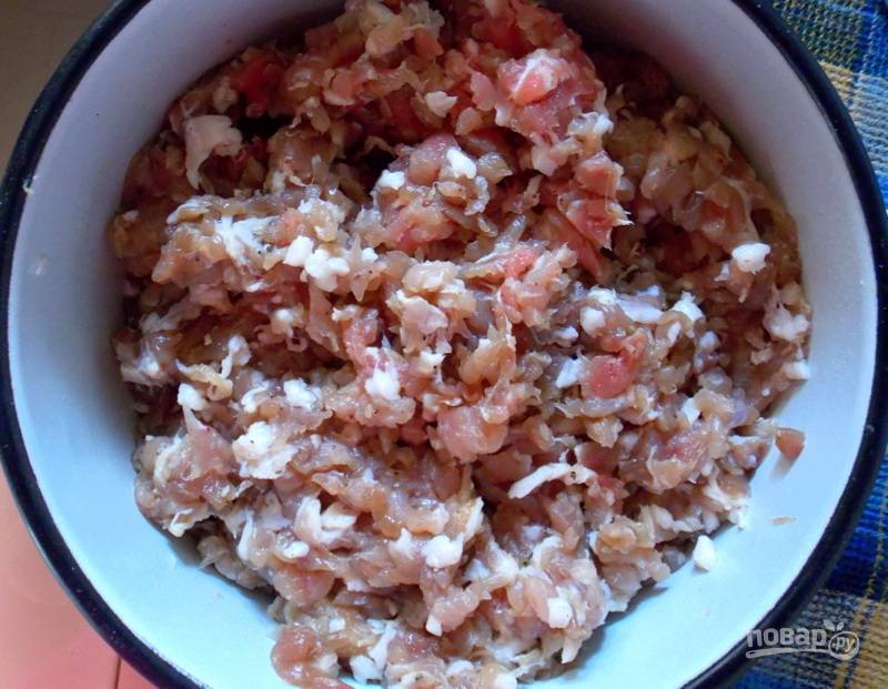 Добавьте два вида соли, мелко нарубленный чеснок и перец, перемешайте.