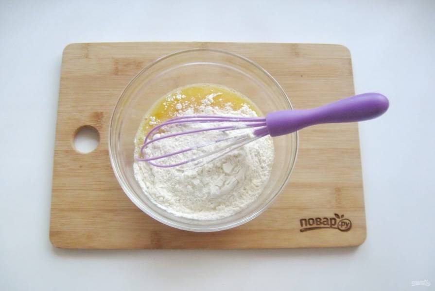 Всыпьте муку и перемешайте. Если тесто получится сухим, то налейте немного воды, буквально 1-2 столовые ложки.