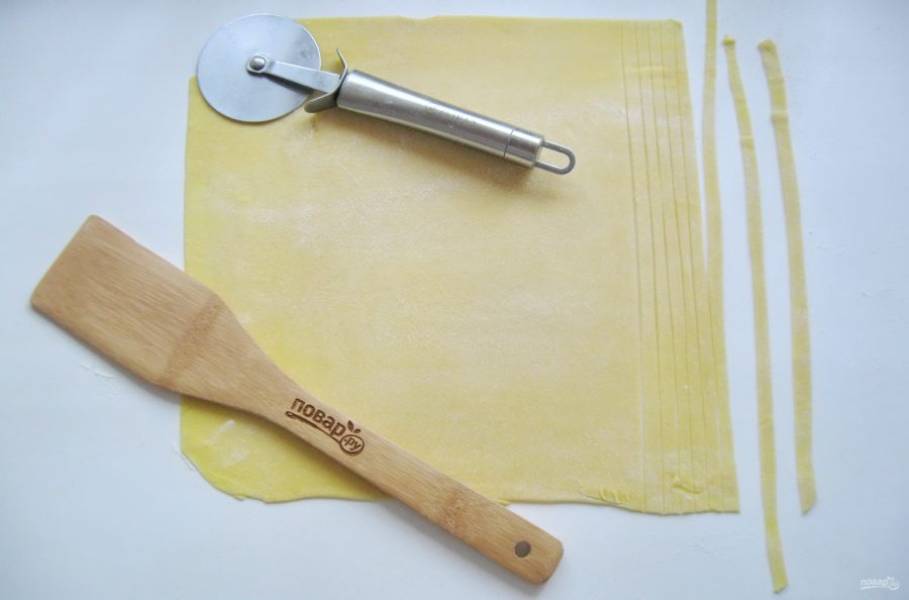 С помощью ножа нарежьте тесто на полоски шириной 1 сантиметр.