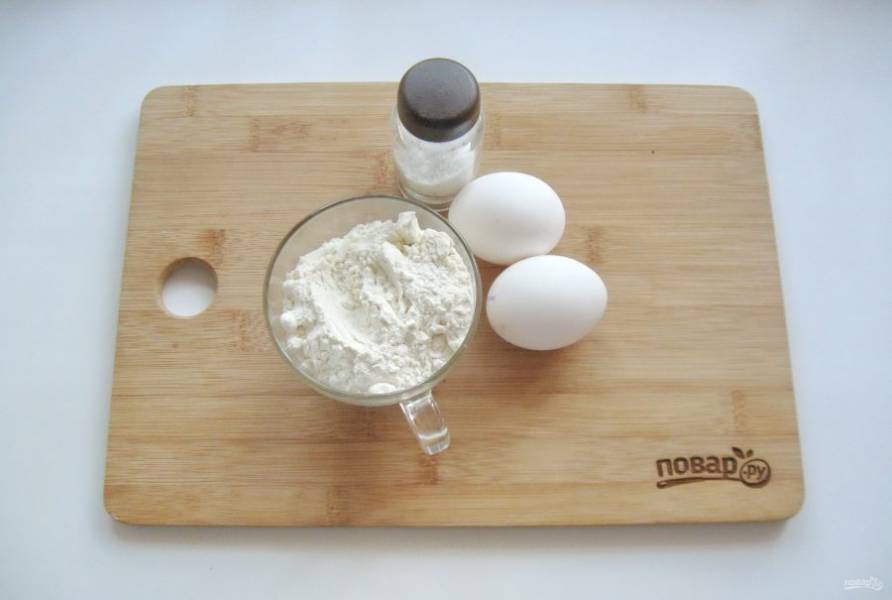 Возьмите муку пшеничную, яйца и соль для приготовления домашней лапши.