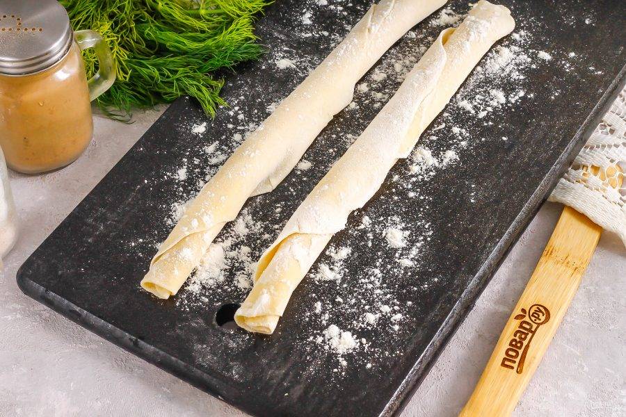 Разделите тесто на части и раскатайте каждую из них в тонкий пласт любой формы. Тщательно присыпьте мукой и сверните рулетиком. Дайте подсохнуть примерно 3-4 часа.