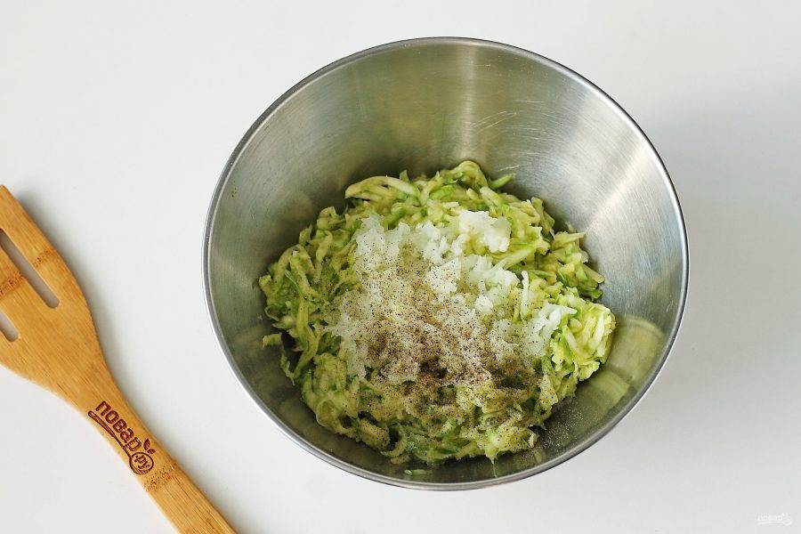 Переложите в глубокую миску, добавьте тертый на крупной терке лук. Посолите все и поперчите по вкусу.