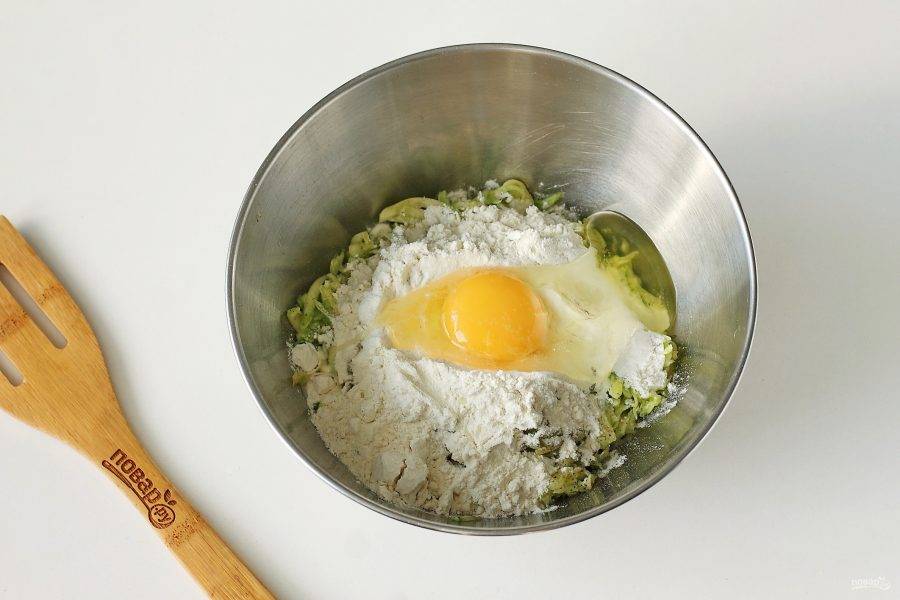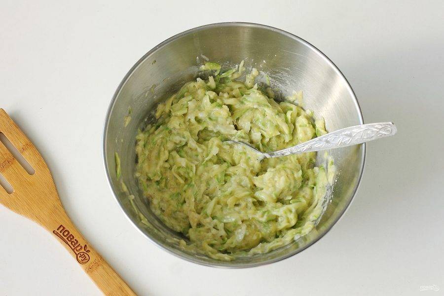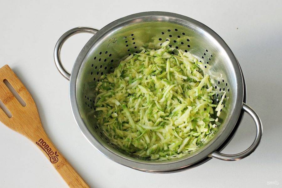 Кабачок натрите на крупной терке. Добавьте щепотку соли и оставьте на 5-7 минут. Затем отожмите от выделившегося сока.