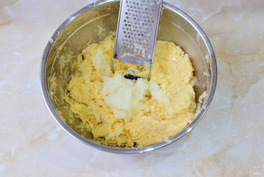 Очищенный картофель потрите на мелкой терке. Если появится сок, то его необходимо сливать.