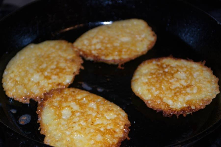 На растительном масле обжарьте драники с двух сторон до золотистой корочки. Выкладывайте тесто на сковороду столовой ложкой.